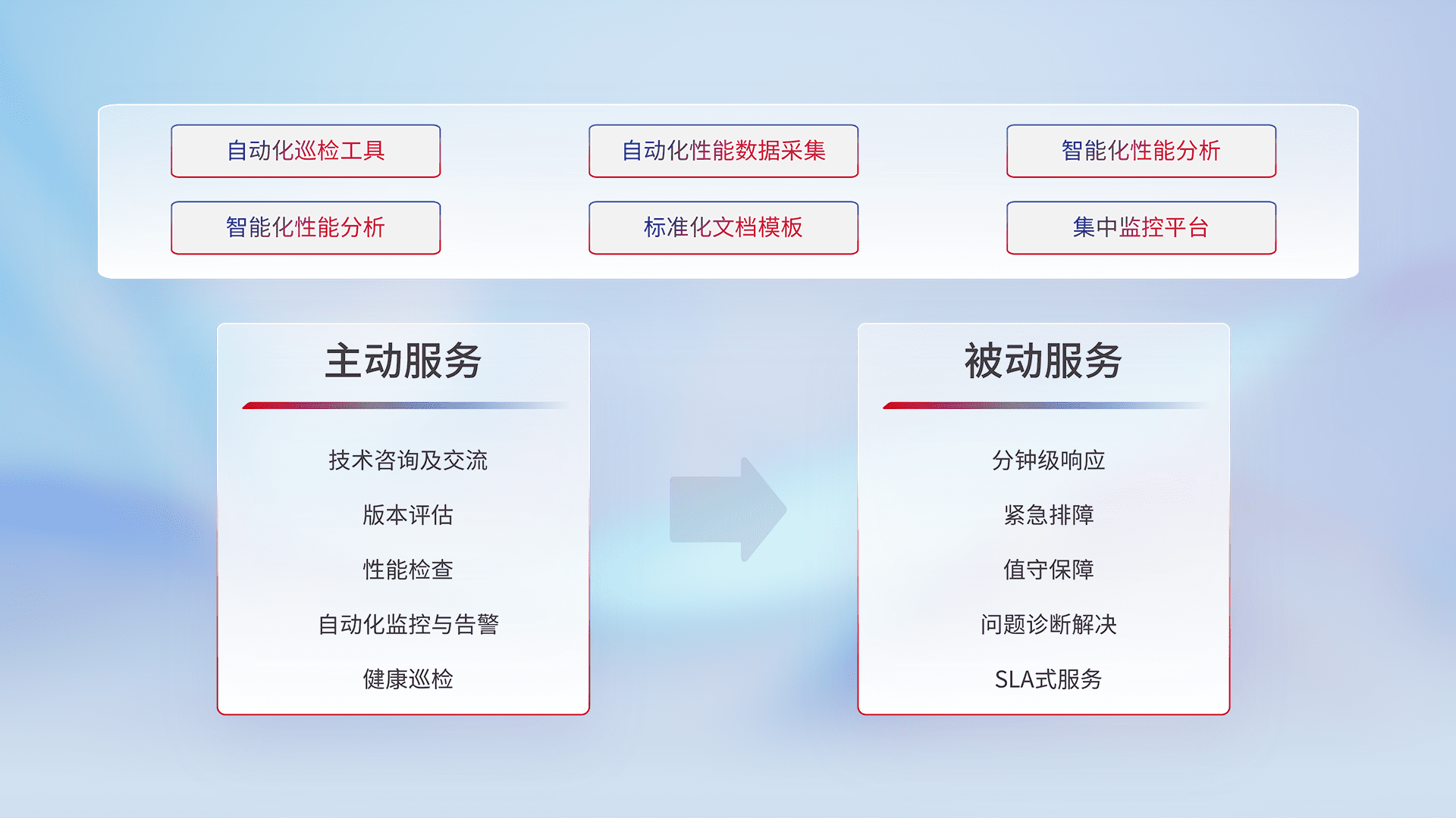 智能化工具和标准化文档,,,,保障服务质量,,,,提供主动服务(包含技术咨询、、、版本评估、、、性能检查、、、、自动化监控与告警、、健康巡检)和被动服务包含(分钟级响应、、紧急排障、、、、值守保障、、问题诊断解决、、、SLA服务)。。。。